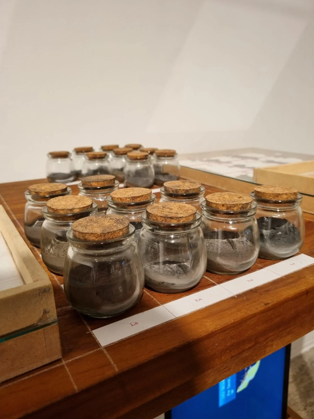 Arriba: 18 pomos conteniendo ceniza de libros y documentación incinerada. Dos marcos compuestos a base de salitre y litio conteniendo 9 mapas del Perú cada uno, compuestos por las cenizas de los libros y la documentación incinerada. Abajo: dos pantallas con video performativo, instrucciones y constataciones notariales.